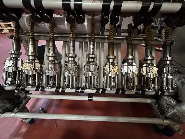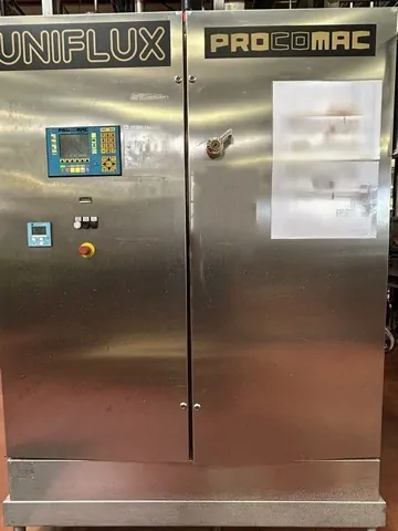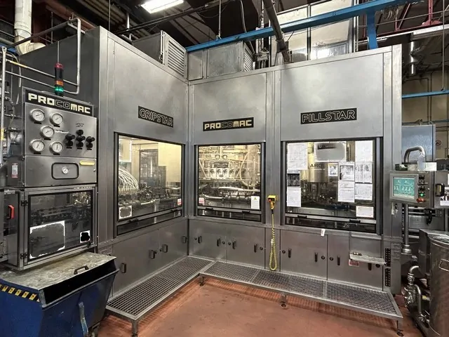 Used Filling Monoblock Procomac 50.56.8.8 Year: 2000 Speed: Sparkling wine: 7,000 bph Still wine: 10,000 bph Direction: Clockwise Rinser 50 clamps Mobile nozzle Double treatment (first with ozonated water and second with microfiltered water) Filler 56 valves Degassing Autolevel Pre-evacuation 8-head corker Natural straight cork Champagne cork 8-head Aluminium screw corker Screw cap 31.5×18 Screw cap 28×15 Screw cap 30x 60 (Stelvin) Safety protections Microfiltration system + CIP included Ozonizer included Elevator/orientator for Natural straight and champagbne corks CAMES mod. P DUE E RF year 2004 included Pneumatic cap elevator for aluminum screw caps PELACCI year 2000 included